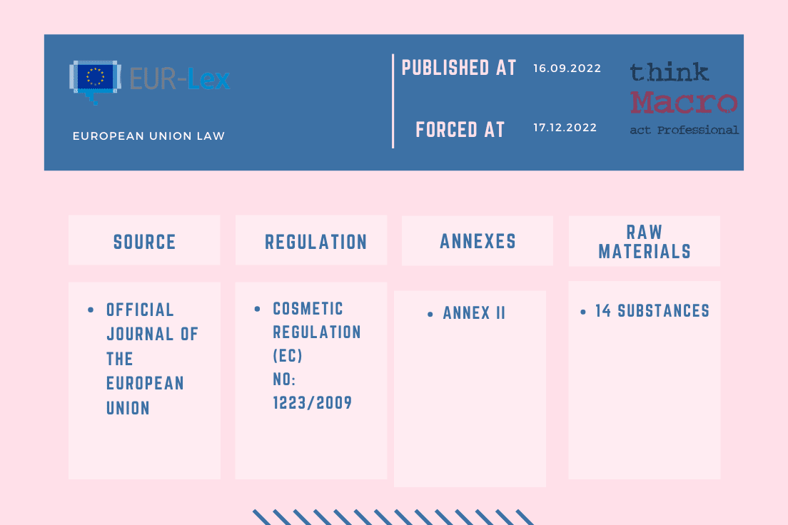 Avrupa Parlamentosu ve Konseyi 16 Eylül 2022’de 1223/2009 sayılı tüzüğün, kanserojen, mutajenik veya üreme için toksik olarak sınıflandırılan belirli maddelerin, kozmetik ürünlerinde kullanımına ilişkin olarak tadil etmek ve bu tüzüğün düzeltilmesi ile ilgili bir karar yayınlanmıştır. Bu karara ilişkin 1223/2009 sayılı Kozmetik Yönetmeliği’nin Ek II (Yasaklı Olan Maddeler) listesine 14 adet bileşen daha eklendiğini duyurmuştur.